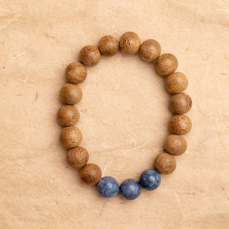 16 natural agarwood beads 10mm blended with 3 blue coral beads 10mm.