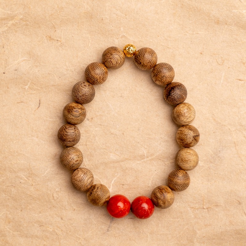 16 natural agarwood beads 10mm blended with 2 red coral beads 10mm and a 24K gold charm.