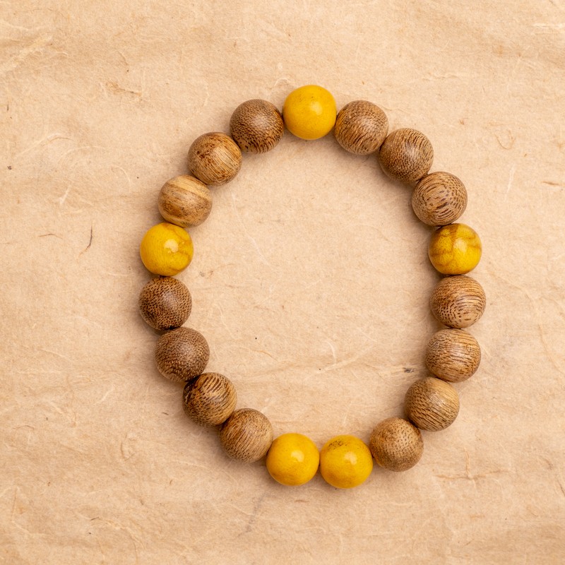 14 natural agarwood beads 10mm blended with 5 yellow coral beads 10mm.