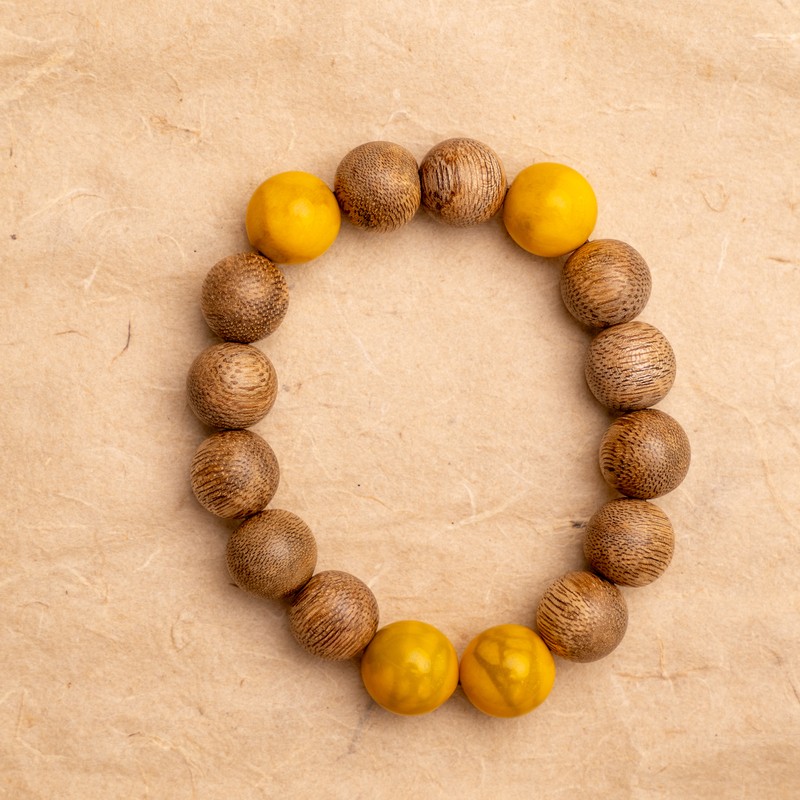 12 natural agarwood beads 12mm blended with 4 yellow coral beads 12mm.