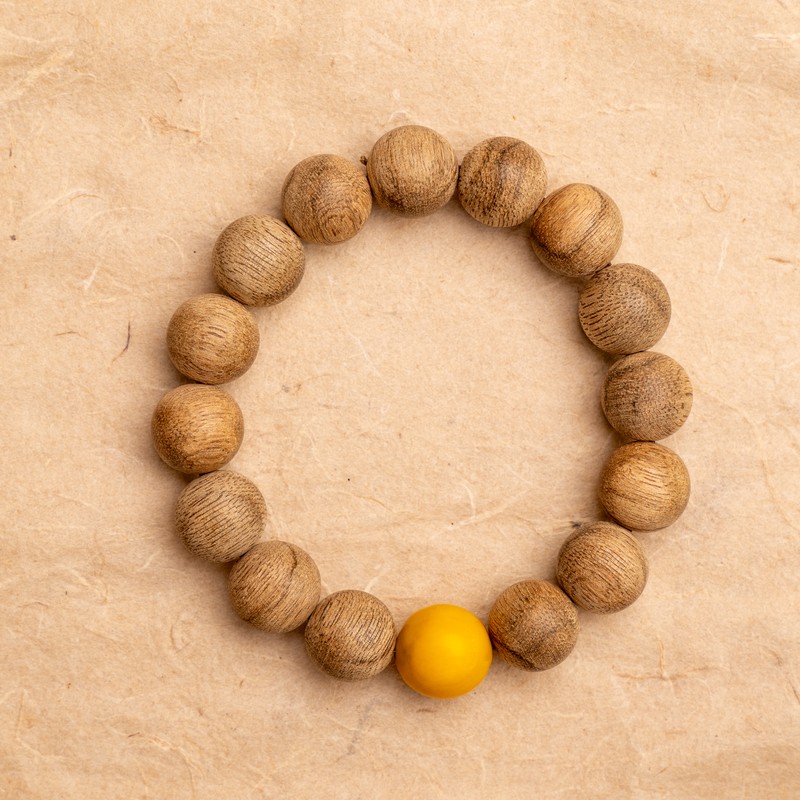 15 natural agarwood beads 12mm blended with 1 yellow coral bead 12mm.