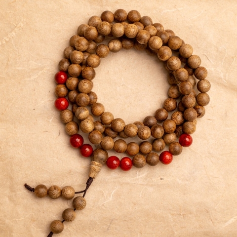 - 92 hạt trầm tự nhiên 6 ly và 16 san hô đỏ 8 ly.