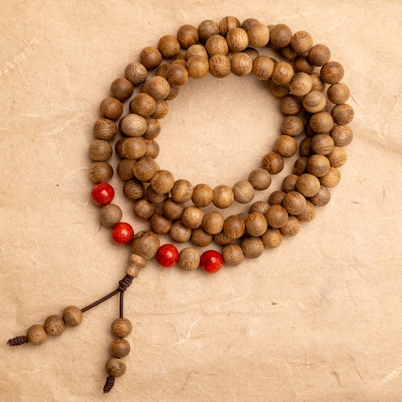 104 hạt trầm tự nhiên 8 ly phối với 4 hạt san hô đỏ 8 ly.