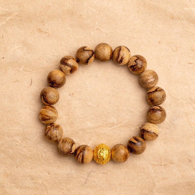 17 hạt trầm vân tự nhiên 10 ly phối với charm tròn vàng 24K.