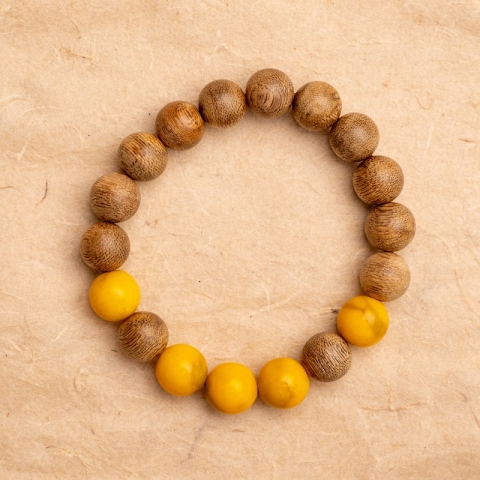 10 hạt trầm tự nhiên 12 ly phối với 5 hạt san hô vàng 12 ly, phụ liệu bạc Thái.